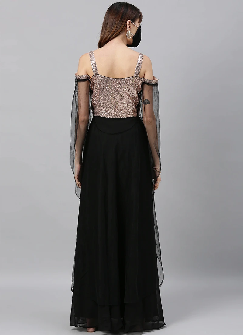 Black Sequins Embroidered Dupatta Style Cape Gown Party Wear