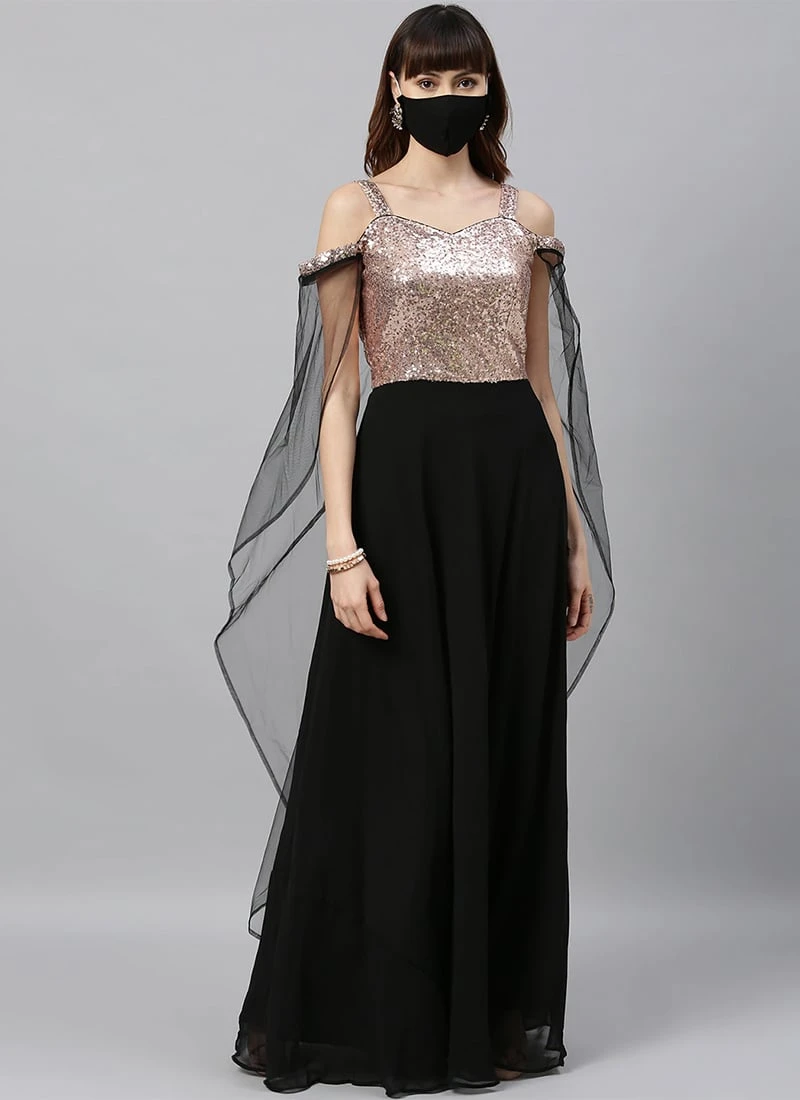 Presenting a black ombre sequins embroidered gown, features strap neckline both in front and back, strap sleeves,yoke until natural waist length, comes with black georgette medium flare until floor length and has back zip opening. It is paired up with a non detachable cape style dupatta attached to the sleeves. Mask only for shoot purposes.Refer the fabric image for true color of the dress. This dress is custom designed from fabric and custom stitched. Once sold cannot be returned.Designs, colors, and patterns on the actual product may slightly vary from designs shown in the image. Images are the only representative