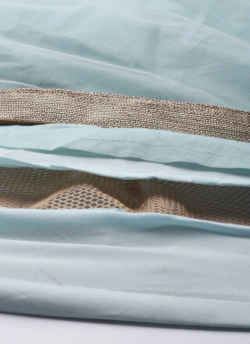 Presenting a blue net embroidered gown, features collar neckline both in front and in the back, the front has keyhole detailing along with a loop and potli ball opening on the collar, sheer full sleeves, yoke until natural waist, embroidered full circular flare until knee length, followed by two layers of plain mint green net gathered flare from knee to calf and calf to floor-length with beige gold borders at the hemline. The gown has side zip closure. Cancan is preferred for voluminous flare. Mask only for shoot purposes.Refer the fabric image for true color of the dress. This dress is custom designed from fabric and custom stitched. Once sold cannot be returned.Designs, colors, and patterns on the actual product may slightly vary from designs shown in the image. Images are the only representative