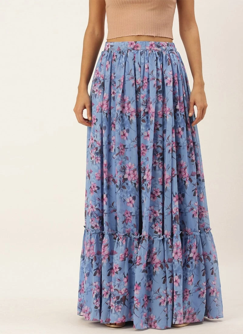 Blue N Pink Digital Printed Georgette Tiered Skirt Festive Wear