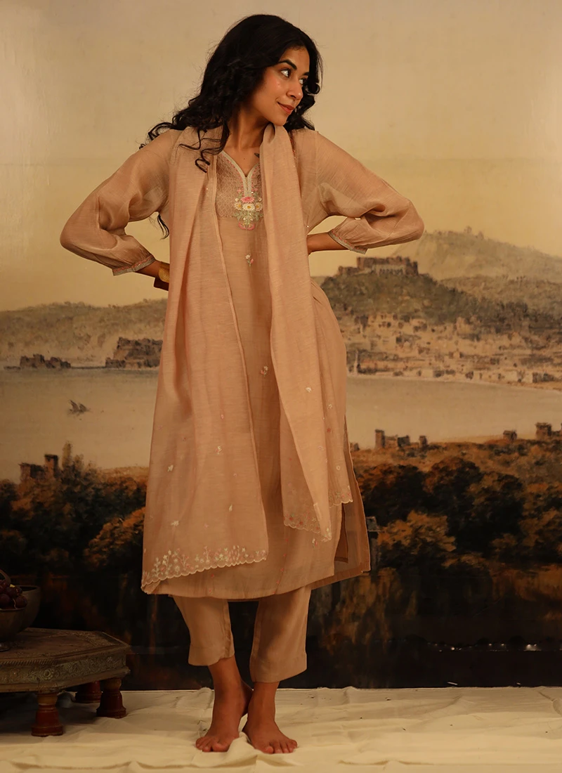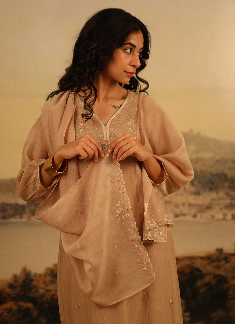 Introducing the elegant Chikku Brown Chanderi Silk Embroidered Dupatta the perfect accessory to enhance your party wear ensemble for special occasions and festive celebrations. This exquisite dupatta seamlessly combines traditional charm with contemporary style making it an ideal choice for events like Bhai Duj Diwali Eid Pongal Raksha Bandhan and various other joyous gatherings.Crafted with utmost precision and artistry this dupatta exudes a sense of grace and sophistication. The Chikku Brown chanderi silk fabric lends it a luxurious feel elevating your outfit to new heights of elegance. The smooth and lightweight texture of chanderi silk drapes effortlessly adding a touch of regality to your overall look.Adorned with intricate embroidery this dupatta showcases delicate patterns that reflect the rich cultural heritage of India. The embroidery work features fine threadwork sequins and zari adding a subtle shimmer to the ensemble. These ornate embellishments not only enhance the visual appeal of the dupatta but also infuse it with a sense of timeless beauty and glamour.The Chikku Brown hue of the dupatta symbolizes purity and serenity making it a versatile accessory that complements a wide range of party wear outfits. Whether youre wearing a traditional salwar kameez an elegant lehenga or a chic fusion ensemble this dupatta effortlessly adds a touch of sophistication and completes your look with finesse.The generous size of the dupatta allows for various draping styles offering you the freedom to experiment and create your own unique fashion statement. Drape it gracefully over your shoulders or let it cascade down your arms for an ethereal look that exudes grace and charm.Whether youre attending a vibrant Diwali celebration a joyous Eid gathering a colorful Pongal festival or celebrating the bond of love on Raksha Bandhan the Chikku Brown Chanderi Silk Embroidered Dupatta is the perfect companion. It adds a touch of elegance and enhances the festive spirit of any occasion making you feel like the epitome of grace and style.Pair this stunning dupatta with your favorite party wear outfit complement it with statement jewelry and matching accessories and get ready to make a lasting impression. With the Chikku Brown Chanderi Silk Embroidered Dupatta youre sure to shine bright and create cherished memories at every festive event.