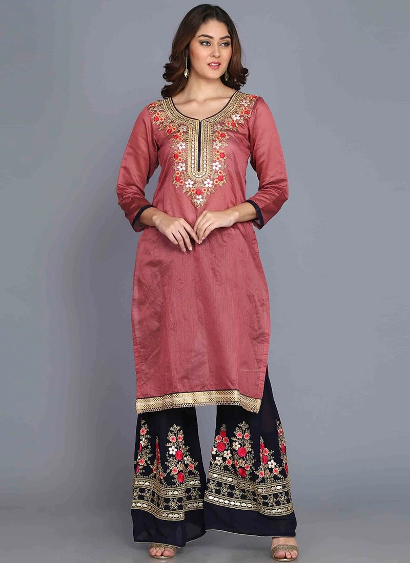 Be the centre of attention in this dusty pink chanderi silk kurta sharara set. This lovely kameez comes with machine embroidery work on the dress and crafted with round neck and three fourth sleeves looks chic. This set comes with black georgette with machine embroidery sharara pant bottom.achine embroidery sharara pant bottom.
