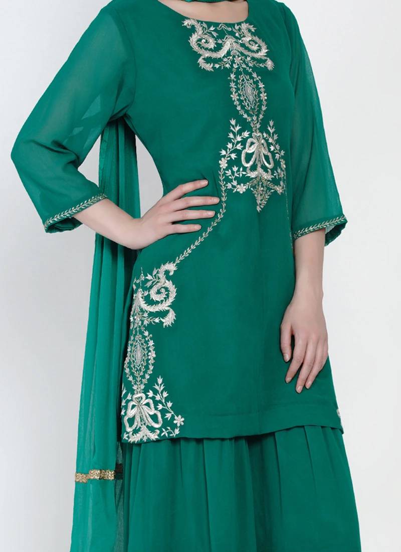 This product consists of semistitched top, bottom and dupatta fabric. This can be stitched using the custom tailoring options below. To buy semi-stitched fabric, just choose the unstitched option.