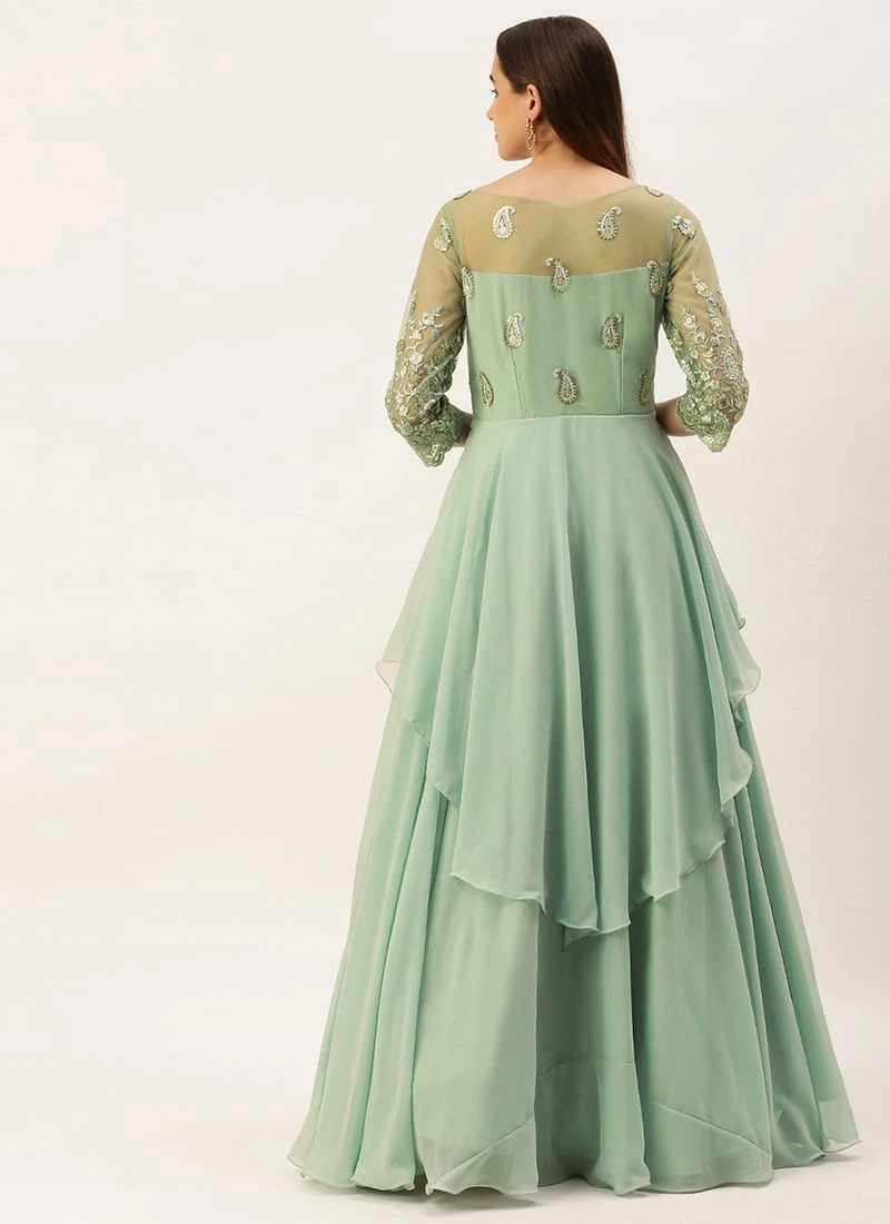 Light Blue Embroidered N Green Layered Gown Wedding Wear