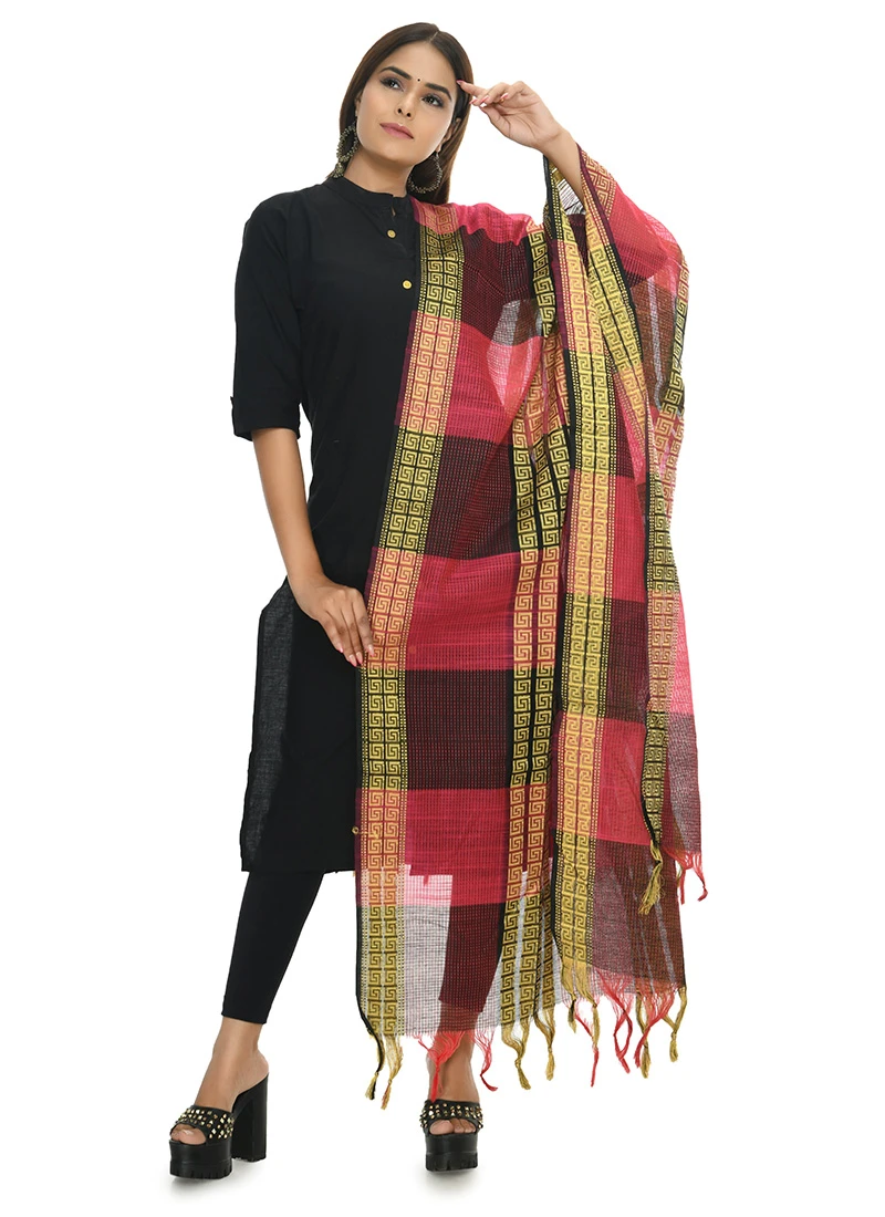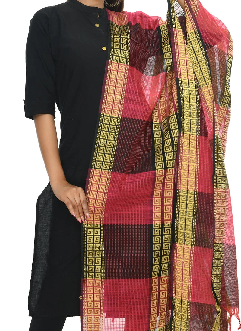 Checked Black Handloom Cotton Weaving Work Dupatta Work Wear