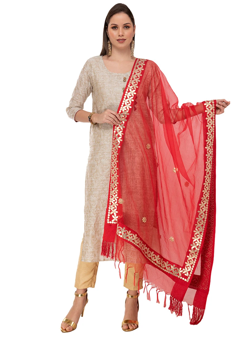 Look charming in this red color organza cotton dupatta with gota patti work looks chic and pretty.
