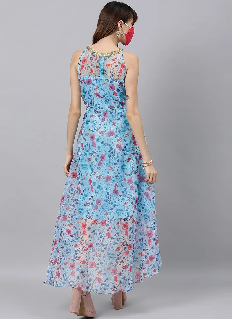 Sky Blue Printed Organza Asymmetrical Dress After Six Wear