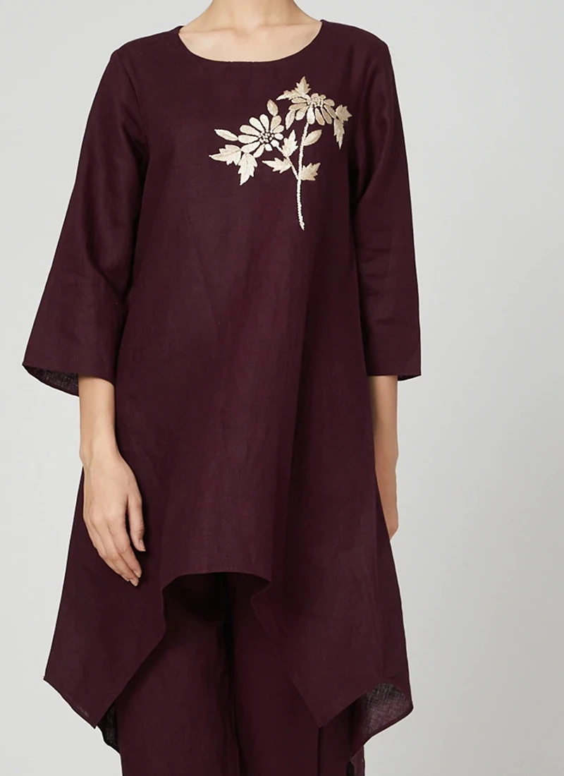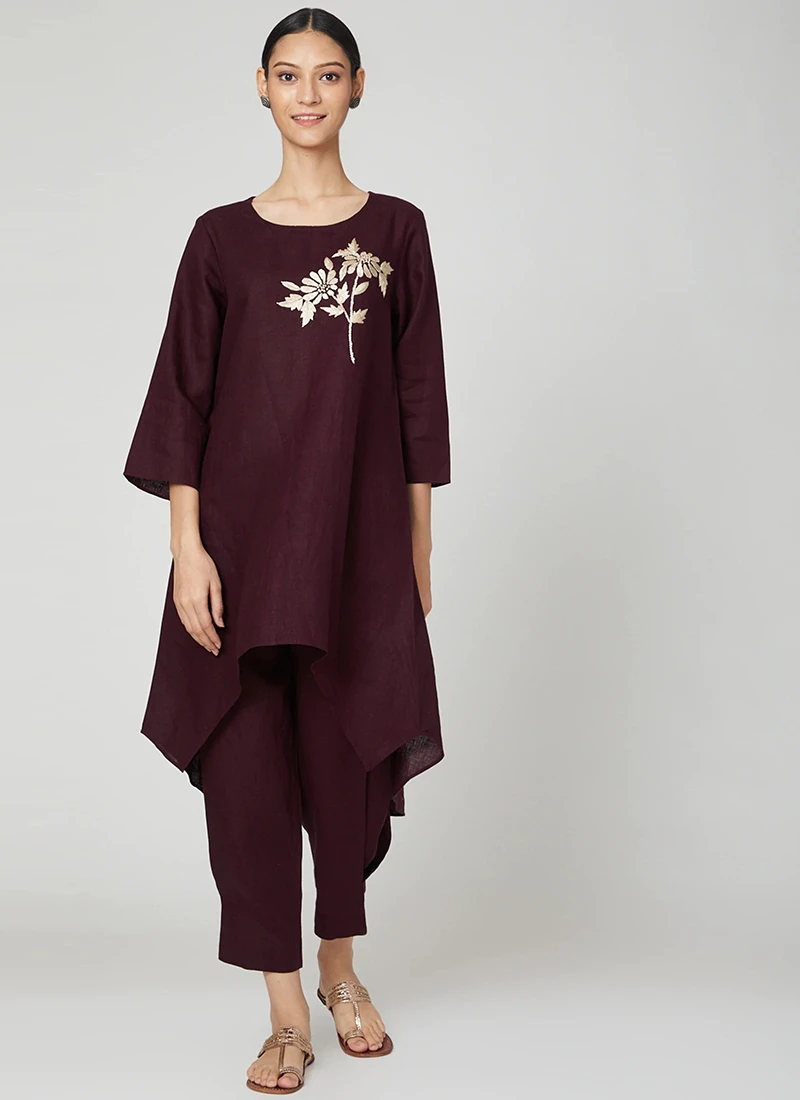 Wine Linen Kurta Straight Pant Set Work Wear