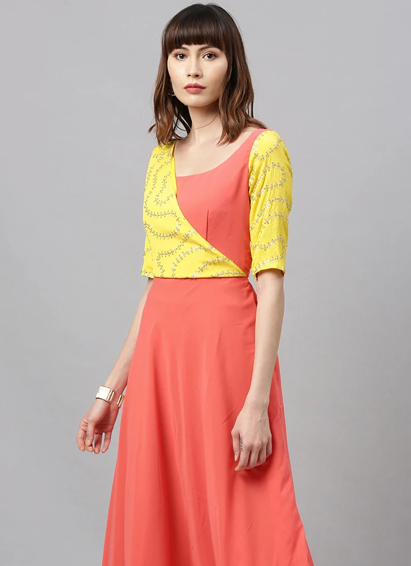 Yellow Embroidered N Peach Overlapping Style Gown Party Wear