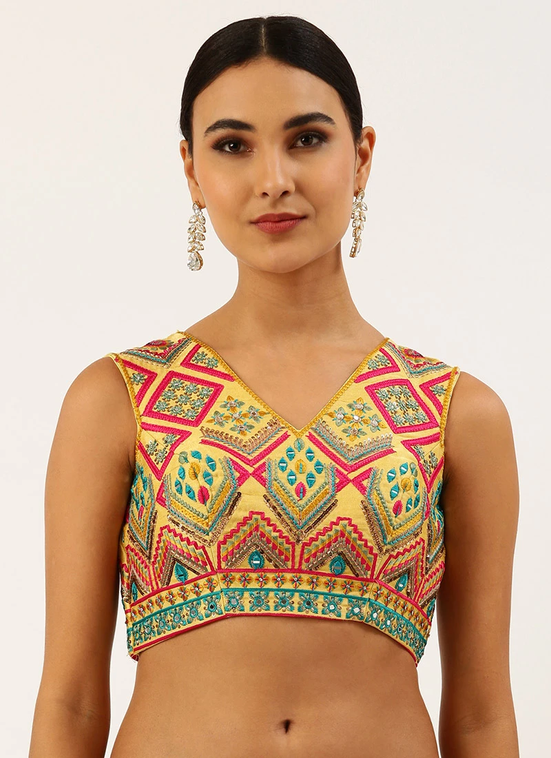 Make an adorable statement in this yellow color silk readymade blouse beautified with mirror embroidery and sequins work and crafted with V neck and sleeveless with back hook.